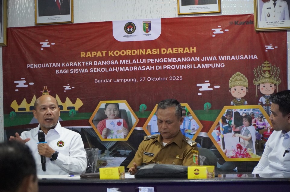Hal tersebut disampaikan Deputi Bidang Koordinasi Penguatan Karakter dan Jati Diri Bangsa Kemenko PMK, Warsito, saat membuka Rapat Koordinasi Daerah (Rakorda) Penguatan Karakter Bangsa melalui Pengembangan Jiwa Kewirausahaan bagi Siswa Sekolah dan Madrasah di Aula Bhineka Tunggal Ika, Badan Kesbangpol Provinsi Lampung, pada Senin (27/10/2025).