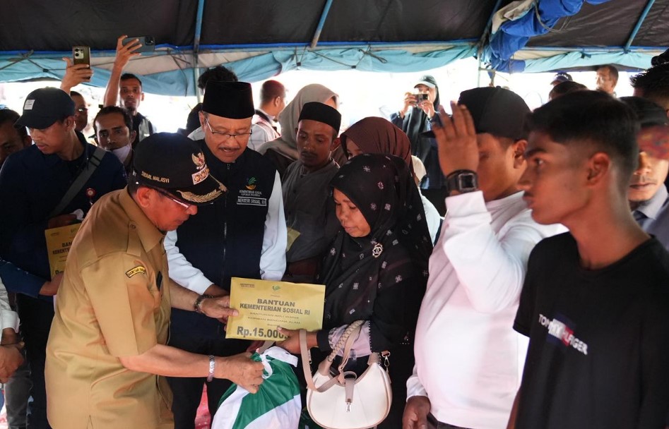SUARAMANADO, Pidie Jaya: Menteri Sosial (Mensos) Saifullah Yusuf atau Gus Ipul meninjau dapur umum Kementerian Sosial sekaligus menyerahkan santunan kepada 31 ahli waris korban meninggal bencana banjir dan longsor di kantor Dinas Sosial P3A, Kabupaten Pidie Jaya, Aceh, Selasa (16/12/2025).
