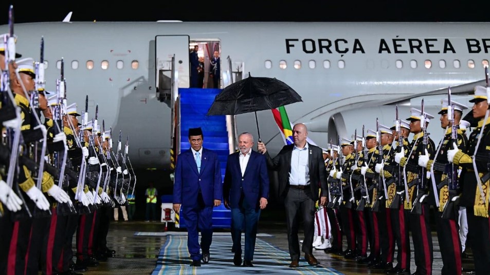 Setelah menyapa para penyambut, Presiden Lula da Silva kemudian berjalan melewati pasukan jajar kehormatan yang berdiri tegak di sepanjang jalur penyambutan. Suasana khidmat bercampur hangat ketika musik drumben militer mengiringi langkah Presiden Lula da Silva menuju kendaraan resmi.
