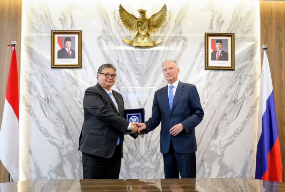 SUARAMANADO, Jakarta: Menteri Koordinator Bidang Perekonomian Airlangga Hartarto menerima kunjungan dari Ketua Dewan Maritim Federasi Rusia sekaligus Penasehat Presiden Federasi Rusia Nikolai Patrushev di Jakarta, Jumat (7/11). Pertemuan tersebut membahas berbagai peluang kerja sama strategis antara Indonesia dan Federasi Rusia, khususnya dalam bidang ekonomi, maritim, logistik, dan pengembangan konektivitas.