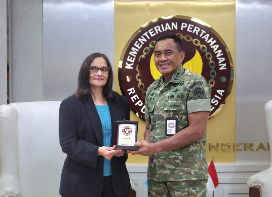 SUARAMANADO, Jakarta: Sekretaris Jenderal (Sekjen) Kemhan Letjen TNI Tri Budi Utomo menerima Courtesy Call Delegasi United Nations Office for Project Services (UNOPS) di kantor Kemhan, Jakarta, Selasa (21/10/2025). Delegasi UNOPS dipimpin oleh Director of Southeast Asia and Pacific Multi Country Office UNOPS Ms. Samina Kadwani.